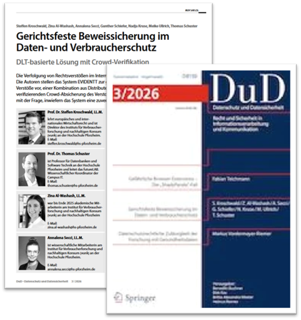 Kroschwald, S./Schuster, T./Al-Washash, Z./Secci, A./Kruse, N./Ullrich, M./Schiefer, G., Gerichtsfeste Beweissicherung im Daten- und Verbraucherschutz – DLT-basierte Lösung mit Crowd-VerifikationDuD 3/2026, S. 145-151