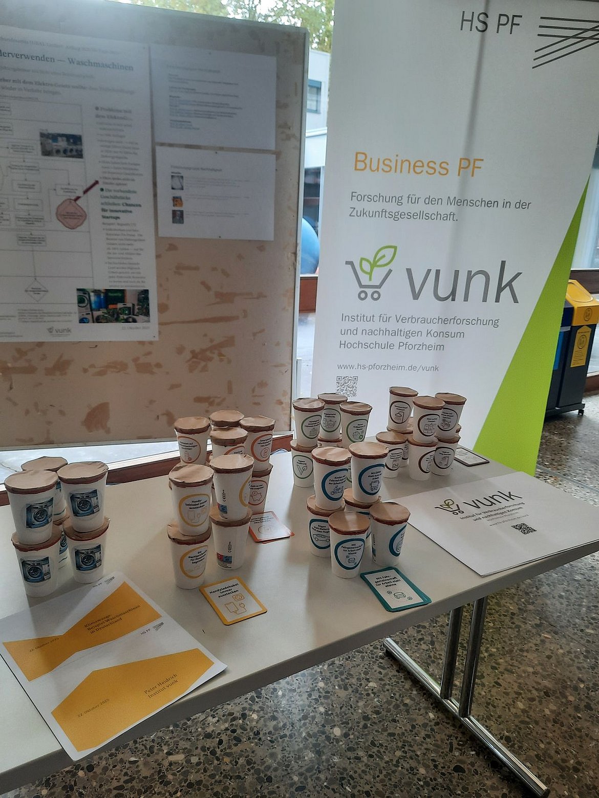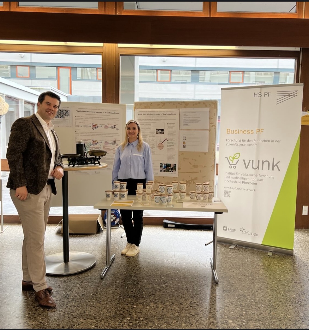 Am 22. Oktober 2025 hatten Hochschulangehörige die Möglichkeit, sich an verschiedenen Info-Ständen über Nachhaltigkeitsaktivitäten in der Hochschule Pforzheim zu informieren. Auch das Institut für Verbraucherforschung und nachhaltigen Konsum (vunk) war mit einem Stand vertreten und setzte in diesem Jahr den Schwerpunkt auf das Thema „Weiße Ware wiederverwenden“ – mit dem Ziel, auf nachhaltige Alternativen im Umgang mit Haushaltsgeräten aufmerksam zu machen.