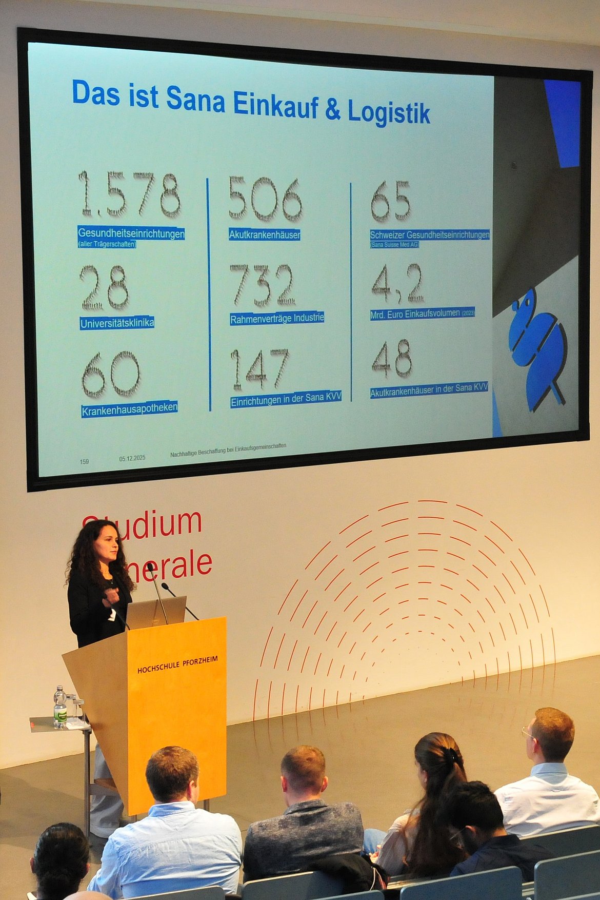 Fiona Walter von der Sana Einkauf & Logistik GmbH erläuterte, wie Nachhaltigkeit schrittweise in Lieferantenbewertungen, Ausschreibungen und Produktvergleiche integriert wird. Sana arbeitet an einem DIN-Standard für Ökobilanzen und einem Tool, das die Umweltwirkung von Produkten transparent und vergleichbar macht – eine Voraussetzung, um nachhaltige Alternativen in die Breite zu bringen.