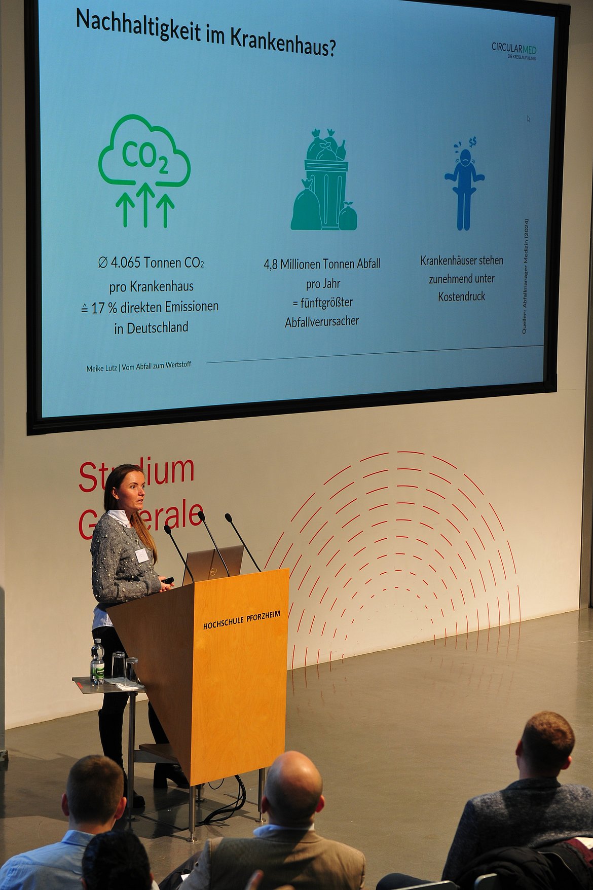 Franziska Zecha von der Hochschule Pforzheim machte anhand aktueller Materialflussanalysen sichtbar, dass medizinische Verbrauchsprodukte einen zentralen Beitrag zu den CO₂-Emissionen und zum Abfallaufkommen leisten: Pro Krankenhausbett entstehen täglich bis zu 2,5 kg CO₂e durch die Materialherstellung sowie die Entsorgung der Verbrauchsmaterialien.