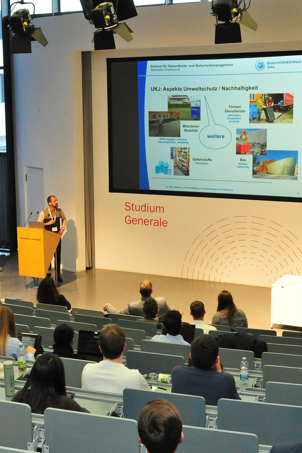 Am Nachmittag standen Vorträge von Alumni und Studierenden des Bachelorstudiengangs BWL-Ressourceneffizienzmanagement (mittlerweile: BWL-Nachhaltigkeit und Ressourceneffizienz) und des Masterstudiengangs Life Cycle and Sustainability auf dem Programm. Den ersten Vortragsblock bestritten die ehemaligen Masterstudierenden Dr. Katharina Gompf, Lucas Hadamek und Isabell Riester. Frau Dr. Gompf zeigte auf, welche Emissions-Reduktionsziele sich die BMW Group gesetzt hat, wie diese auf einzelne Fahrzeugtypen heruntergebrochen und schließlich realisiert werden. Herr Hadamek, der bei der Sphera Solutions GmbH arbeitet, gewährte einen Einblick in seine Tätigkeiten als Consultant und erläuterte, wie er Unternehmen dabei unterstützt, die ersten Schritte in Richtung Ökobilanzierung zu gehen. Im Vortrag von Frau Riester von der Aesculap AG wurde deutlich, dass Produkt-Ökobilanzen und Corporate Carbon Footprints auch in der Medizintechnik zunehmend an Bedeutung gewinnen und dabei das Umweltmanagement in Unternehmen erweitern.
