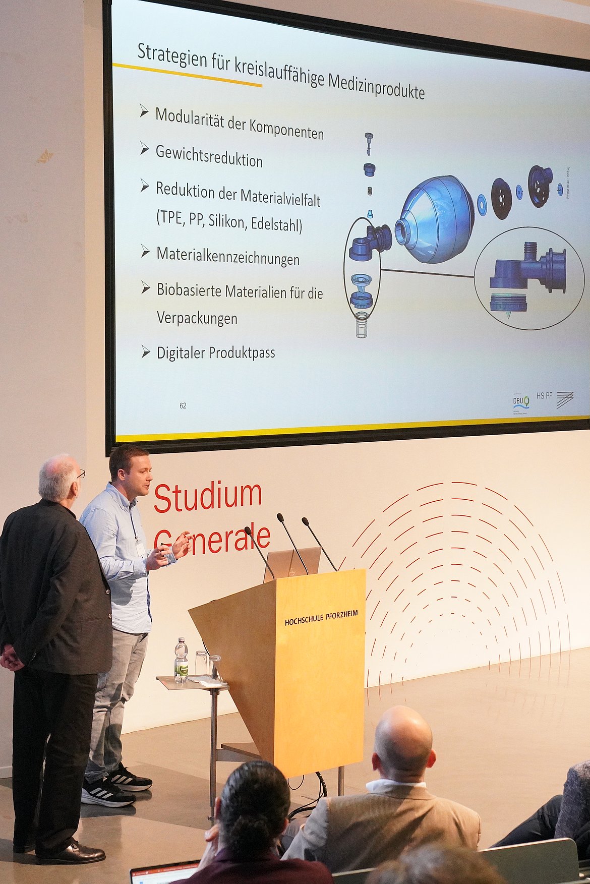 Marcel Kern und Prof. Dr. Ing. habil. Volker Biehl von der Hochschule Pforzheim stellten Design-Strategien zur kreislaufgerechten Produktgestaltung von Medizinprodukten vor. Ferner zeigten sie auf, welche Vorgaben hinsichtlich der Regulatorik zu beachten sind. Im Forschungsprojekt SEB wird das kreislaufwirtschaftliche Potential von Beatmungssystemen untersucht. Ein Teilaspekt beschäftigt sich hierbei mit einem ökobilanziellen Vergleich von Einweg- und Mehrwegbeatmungssysteme, um fundierte Entscheidungshilfen für Hersteller und Kliniken zu liefern.