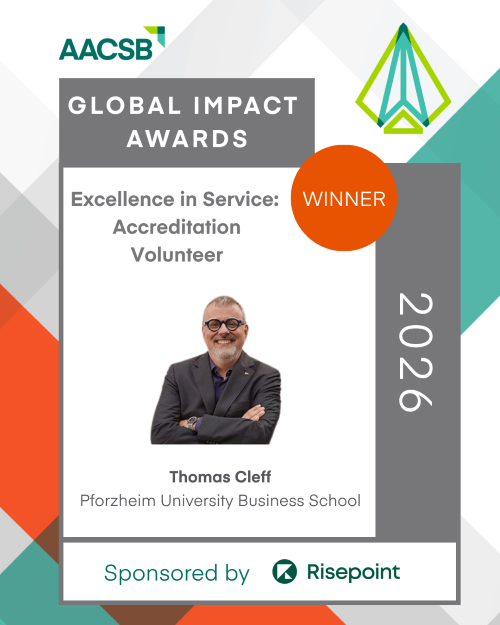 Die Business School der Hochschule Pforzheim freut sich über eine besondere Auszeichnung: Professor Dr. Thomas Cleff, seit 2014 Dekan der Fakultät für Wirtschaft und Recht, erhält den AACSB Global Impact Award 2026 in der Kategorie Excellence in Service: Accreditation Volunteer. AACSB International zeichnet damit Persönlichkeiten aus, die durch ihr langjähriges und weitreichendes Engagement die Qualität der internationalen Managementbildung maßgeblich stärken.