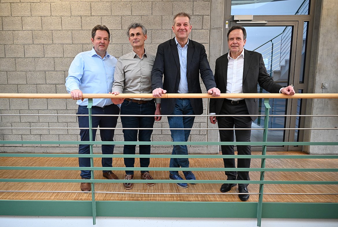 Ein besonderer Moment des Übergangs: Professor Dr.-Ing. Ingolf Müller, Dekan der Fakultät für Technik, Prodessor Dr.-Ing. Jürgen Bauer, Prodekan des Bereichs Maschinenbau, Biomechanik und Produktentwicklung, Professor Jürgen Wrede und Rektor Professor Dr. Ulrich Jautz bei der feierlichen Verabschiedung in den Ruhestand (v.l.n.r.)