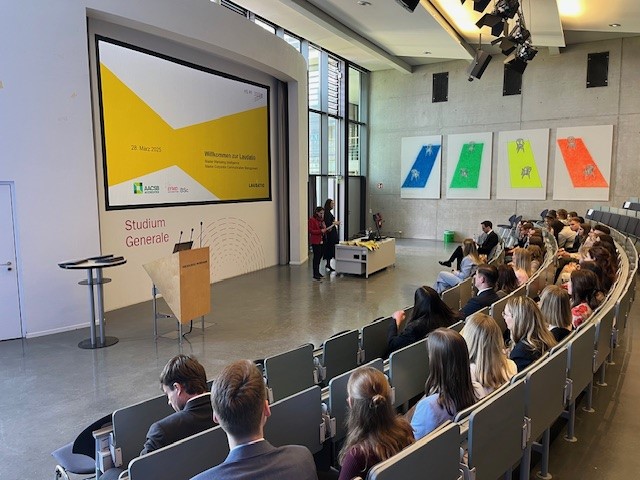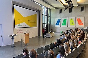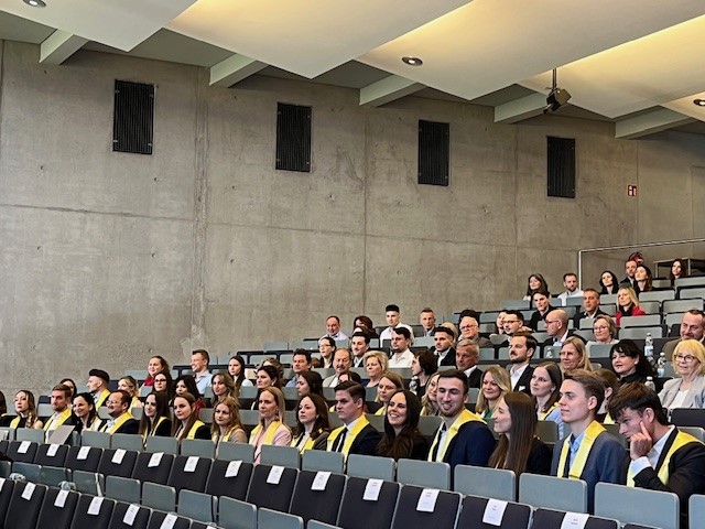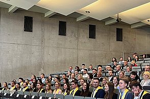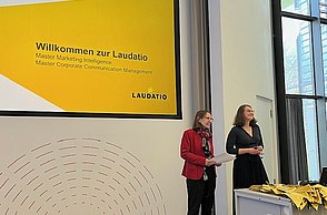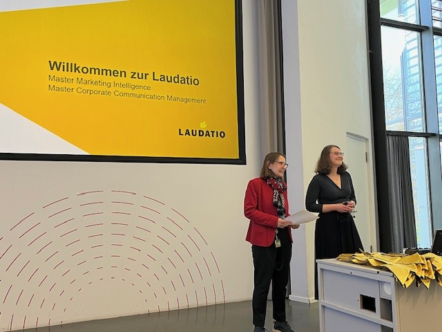 Für die Absolventinnen und Absolventen der Masterstudiengänge Marketing Intelligence und Corporate Communication Management begann der Mittag mit einer dezentralen Verabschiedung im Audimax der Hochschule.