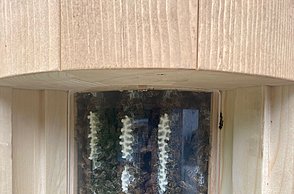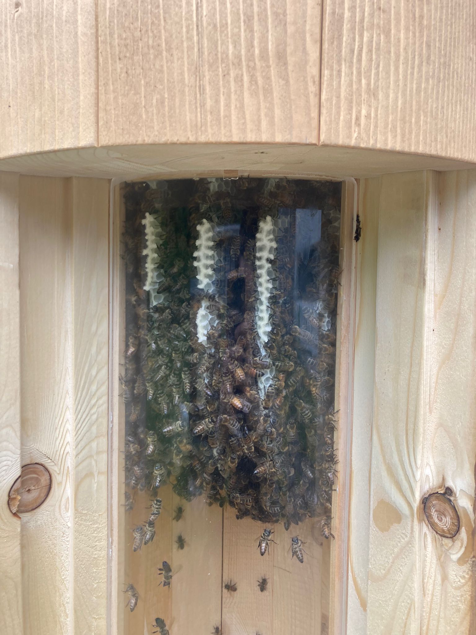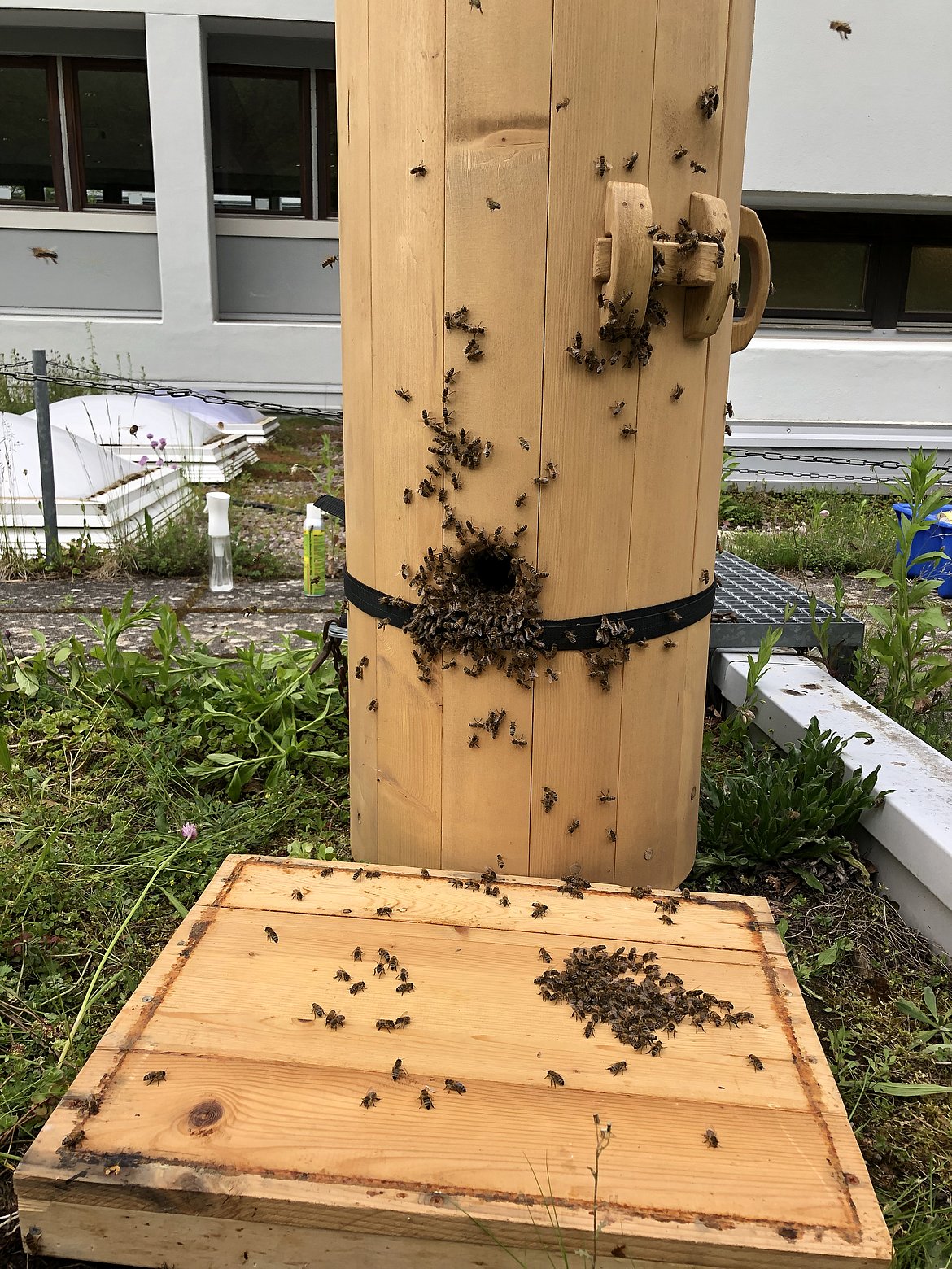 Erst 2025 zog ein Bienenschwarm in die eigens für das Projekt angeschaffte Klotzbeute ein. Diese traditionelle Bienenbehausung, die einen hohlen Baumstamm imitiert, ist dem natürlichen Lebensraum der Bienen nachempfunden. In der Klotzbeute können die Bienen ihren Wabenbau frei gestalten, was ihre Gesundheit und ihr Wohlbefinden fördert