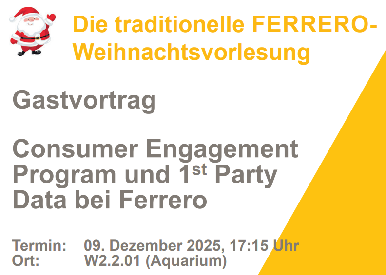 Wir möchten Sie ganz herzlich zur alljährlichen Weihnachtsvorlesung von Uwe Storch, Head of Media bei Ferrero Deutschland und ehemaliger OWM-Vorsitzender, sowie von Eddy Perner, CEP Manager (Consumer Engagement Program) bei Ferrero, einladen.