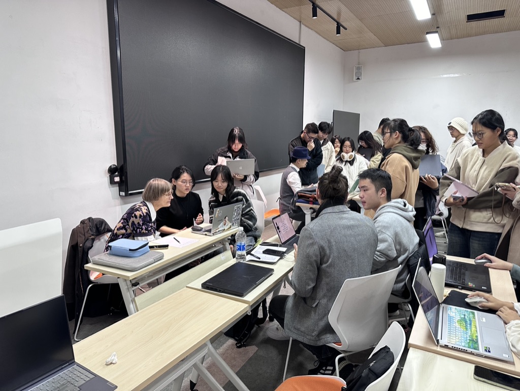 In Zusammenarbeit mit einem Unternehmen, das Verstärker und Effektgeräte für E-Gitarren herstellt, entwickelten die Studierenden in Changsha eine Interactive-App, die Sound auf neue Art interpretieren und im Alltag erlebbar machen soll. Cosima Striepe und Stefan Barth gaben während der Midterm-Präsentationen Feedback und tauschten sich mit den Studierenden zu deren Konzepten aus.