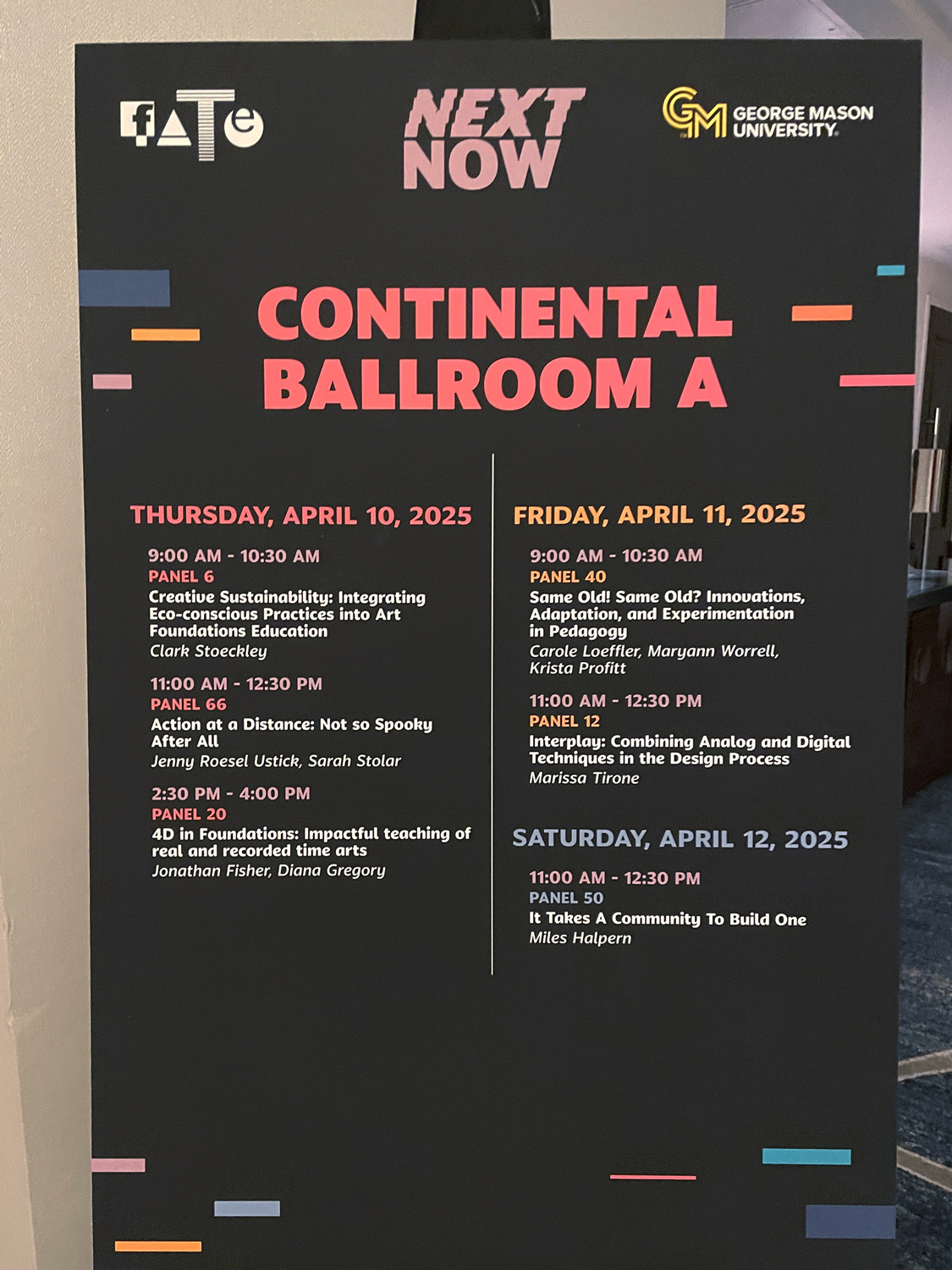 Gehostet wurde die Konferenz von der George Mason University. An einem Nachmittag eröffnete dort die Ausstellung „Next/Now“ mit Arbeiten von FATE-Mitgliedern, und es gab die Gelegenheit, die Hochschul-Räumlichkeiten zu besichtigen, darunter auch spezielle Studios für den Foundation Unterricht.