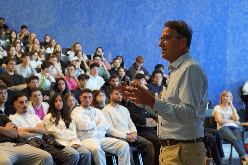Visionen und Ziele machen eine erfolgreiche Führungspersönlichkeit aus. Um die Karriere planvoll anzugehen, sei eine sorgfältige Selbstanalyse die Grundlage, um sich seiner Stärken bewusst zu werden: In welche Richtung soll es gehen? Welche Kompetenzen sind für den Karriereweg erforderlich? Wertvolle Praxiserfahrungen zu sammeln legte Thomas Faller den Studienanfängern besonders ans Herz und riet ihnen, viele Praktika zu machen. Diese könnten im Berufsleben zum Alleinstellungsmerkmal und ebenso wie ein gut aufgebautes Netzwerk zum entscheidenden Faktor bei Bewerbungen werden. „Wenn ihr das, was ihr macht, mit Freude und Leidenschaft macht, kommt irgendwann der Erfolg“, so Faller. Er selbst achte beim Recruiting in erster Linie auf die Persönlichkeit einer Bewerberin oder eines Bewerbers, die neben der fachlichen Expertise, Teamfähigkeit und internationale Ausrichtung eine besondere Bedeutung einnimmt.