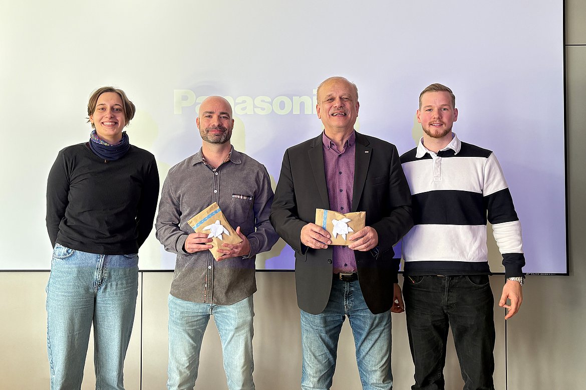 Ein Preis aus der Perspektive der Studierenden: Studienkommissionsmitglieder Sophia Mödinger, und Hans Bauman (links und rechts außen) freuen sich Dr. Thomas Hiller (2. v.l.) und Professor Dr. Roland Wahl (2. v.r.) mit dem Lehrpreis Maschinenbau, Biomechanik und Produktentwicklungauszuzeichnen.