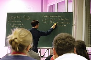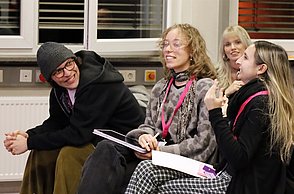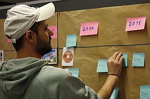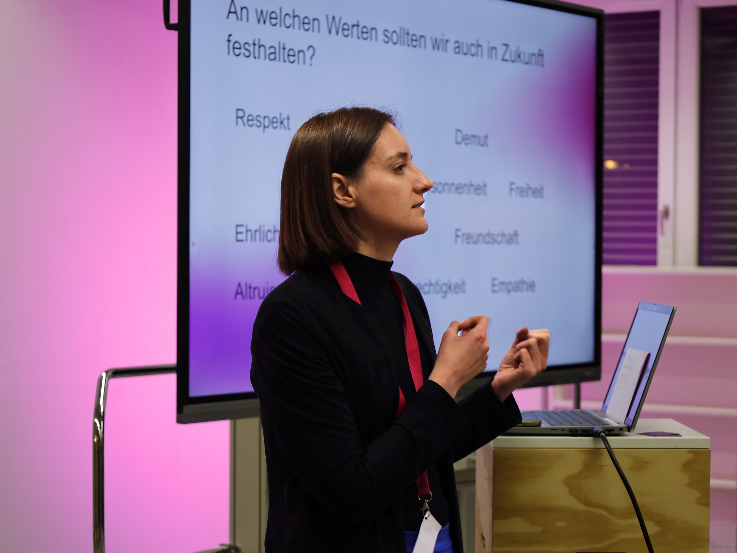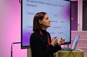 Die zweite Hälfte der Veranstaltung widmete sich der Frage, wie unsere Zukunftsvorstellungen entstehen. Die Teilnehmenden wurden eingeladen, sich vorzustellen, wie ihr Leben zunächst in fünf und dann in fünfundzwanzig Jahren aussehen könnte. Davon ausgehend reflektierte die Runde dann, welche gesellschaftliche Rolle man bei der Gestaltung dieser Zukünfte einnehmen könnte. Zentral für diese Überlegungen war die Reflexion der eigenen Werte. Der Diskurs machte deutlich, dass wir unsere Zukunftsbilder einerseits aus Erfahrungen, Erzählungen und tradierten Lebensentwürfen, andererseits aus einem Gestaltungsspielraum entwickeln, der gerade darin liegt, dass die Zukunft noch nicht festgelegt ist.